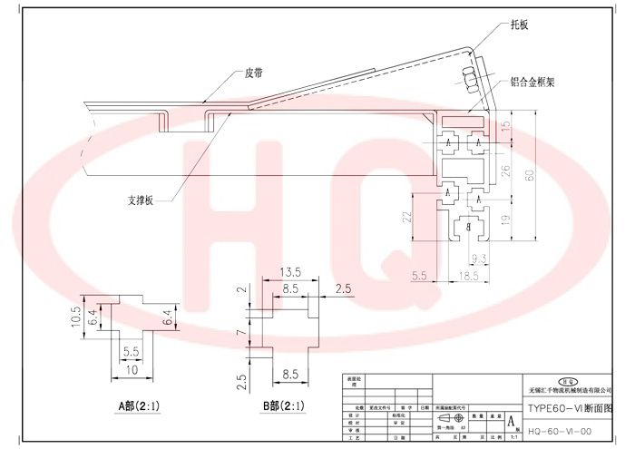 使用60mm鋁合金型材支架,皮帶傳送、中間驅動,直線輸送,驅動部位于皮帶上方,皮帶兩側有導板,皮帶角度成V字型,防止輸送的小物品滑落,適用傳送零散、不規則物品。