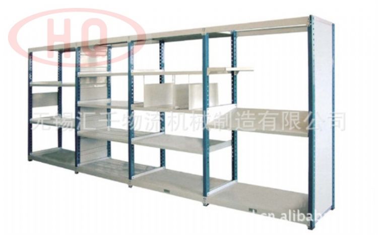 擱板式貨架通常均為人工存取貨方式,組裝式結構,層間距為50mm均勻可調,貨物也常為散件或不是很重的已包裝物品(便于人工存取),貨架高度通常在2.5m以下,否則人工難以觸及(如輔以登高車則可設置在3m左右)。單元貨架跨度(即長度)不宜過長,單元貨架深度(即寬度)不宜過深,按其單元貨架每層的載重量可分為輕、中、重型擱板式貨架,層板主要為鋼層板、木層板兩種。擱板式貨架適合存放零散、輕便的貨物,可以改裝成閣樓式貨架。為了滿足物品更多的存放需求,擱板式貨架還可以配置重梁的支撐(柱),可設計成多層樓層(通常2-3層),配有樓梯、扶手和貨物提升電梯等,這就演變成了閣樓式貨架,特別適用于汽配、電子器件的等企業系列產品的分類保存,承載不大于500kg/㎡。