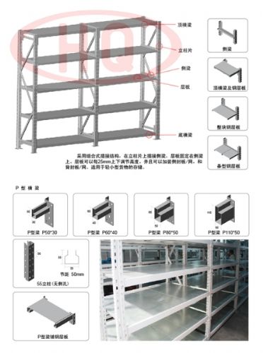 采用輥壓成型的立柱,配合橫/斜撐連接而成的立柱片,掛接多種擱板,貨架穩定性高,承載力較強,安裝拆卸方便,層間距可調,每層層板均布載荷范圍在100-600Kg之間,主要用于小件物品的儲存,可配合零件盒、周轉箱使用。貨架可以單排或背靠背排放,貨架通道約900-1100mm,采用人工揀選儲存。廣泛應用于倉庫、物流配送中心、備件庫、車間暫存區等場所。