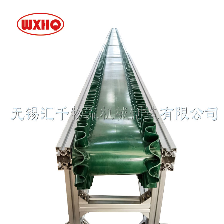 該輸送機(jī)適合運(yùn)輸一些細(xì)碎的零件、鐵皮、碎片等物品,可有效防止物品掉落。皮帶能有效防止物品刮花,減少磨損。