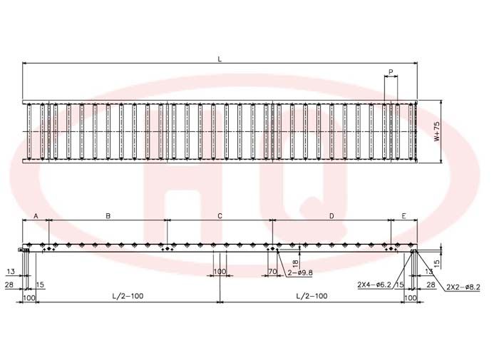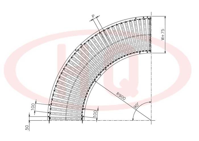 型 號 | 滾筒外徑(φ)×壁厚(t) 軸承 | 軸外徑(φ)×壁厚(t) | 支架形狀I×K×t 輸送機高 (H) | 機 長 L | 滾 筒 幅 寬 W | 滾筒間距 P | 轉彎半徑 | ||||||