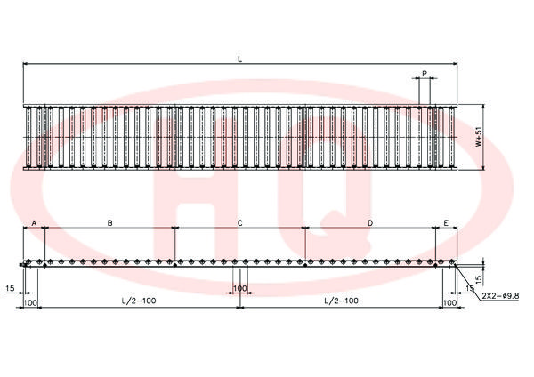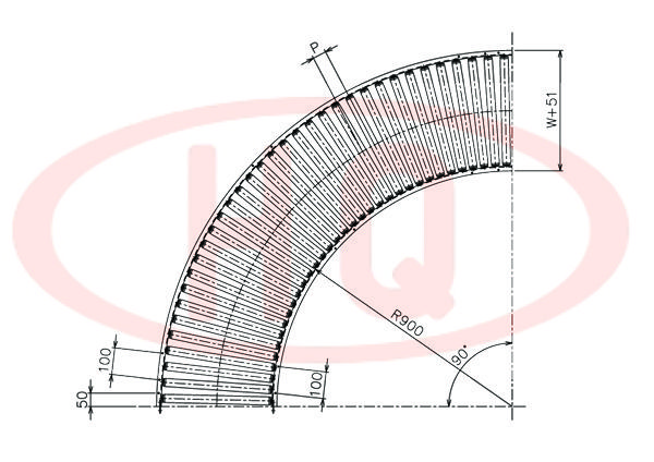 型 號 | 滾筒外徑(φ)×壁厚(t) 軸承 | 軸外徑(φ)×壁厚(t) 加工 | 支架形狀I×K×t | 機 長 L | 滾筒幅寬 W | 滾筒間距 P | 轉彎半徑 R | |||||