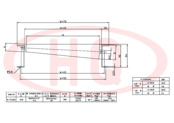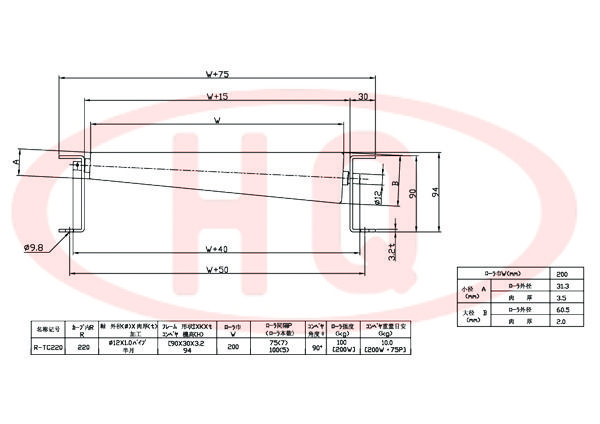 型 號(hào) | 轉(zhuǎn)彎半徑 R | 軸外徑(φ)×壁厚(t) 加工 | 支架形狀I×K×t 輸送機(jī)高(H) | 滾筒幅寬 W | 滾筒間距 P (滾筒數(shù)) | 輸送機(jī) 角度 θ | 滾筒強(qiáng)度 (kg) | 輸送機(jī)重量 (kg) | ||||