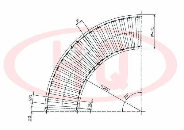 該型輸送機(jī)為90度弧形轉(zhuǎn)彎輸送機(jī),使用錐型滾筒,適用于輸送機(jī)的轉(zhuǎn)彎連接。